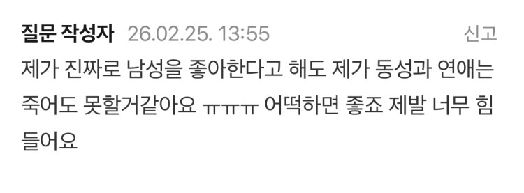제발 진지한 글입니다….저는 지금 고등학생 남자입니다. 저는 예전부터 여자에 관심이 많았고 여성에게 이성적으로 끌렸습니다. 그런데 한 1년전부터 몸이 좋은 남성분들에게도 약간 호감이 가더라고요.. 저도 처음에 이 감정이 무슨 감정인지 잘 모르겠어서 혼란스러웠고 요즘들어 더 혼란스러워 눈물이 나요...그렇다고 해서 여자에게 끌리지 않는다는것이 아니에요 여성에게 성적으로도 끌리고 남성에게도 끌리는게 젤 고민입니다….. 저는 지금도 여자를 좋아하고 앞으로도 여자만 오로지 좋아하고 싶어요…….제발 저도 동성은 눈물날만큼 싫어요 조언이나 해결책좀 부탁드립니다 제발 도와주세요 너무 힘들어요